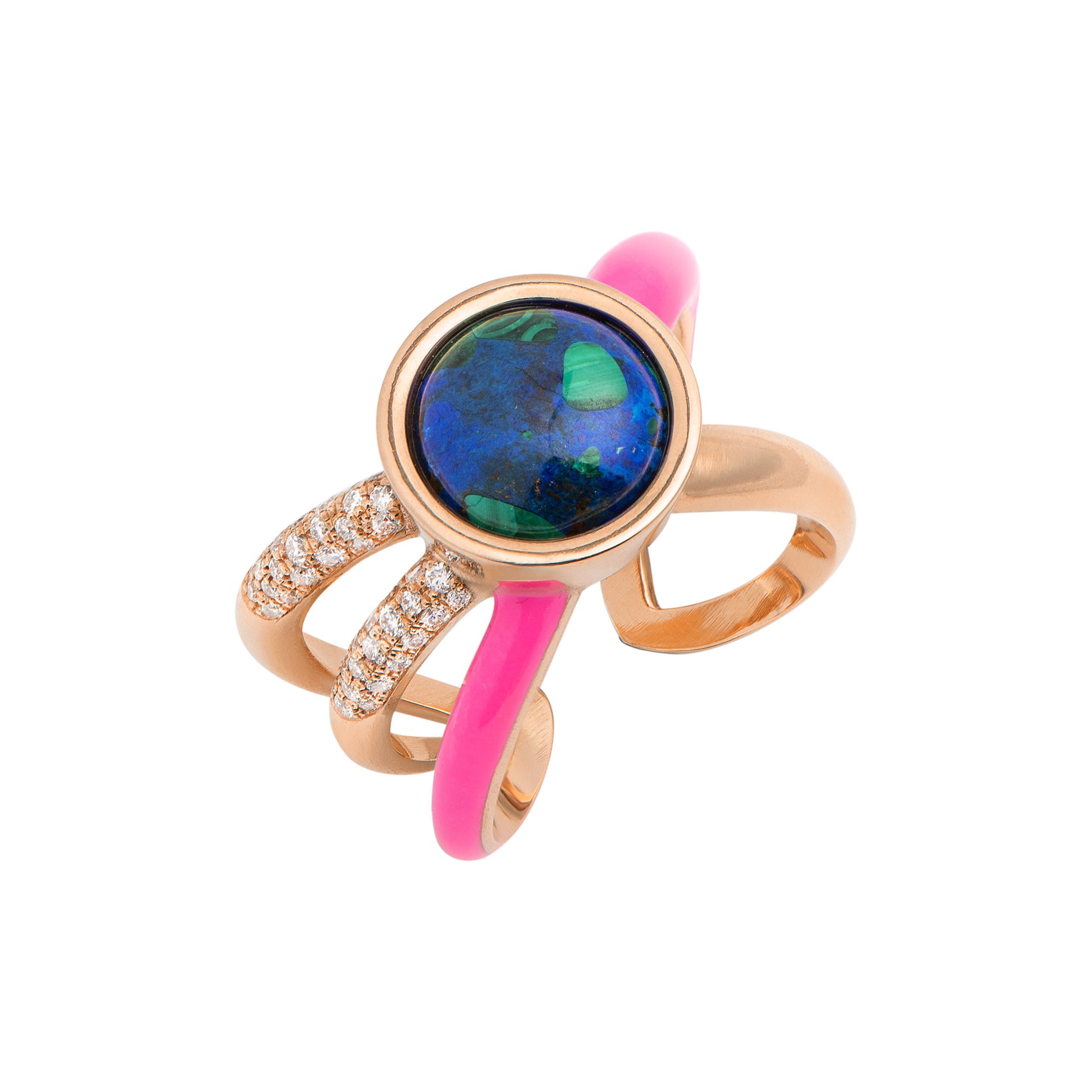 Make a statement with the Asymmetric Globe Ring, a unique creation crafted in 18kt rose gold. At its heart, the round Azurite Malachite gemstone displays mesmerizing hues of green and blue, evocative of the planet’s surface. The ring’s asymmetrical design features three bands on one side and two on the other, embellished with sparkling diamonds and vibrant pink enamel. This distinctive piece not only highlights the allure of asymmetry but also symbolizes that even when the world feels uneven or uncertain, its beauty can still be enjoyed and appreciated.