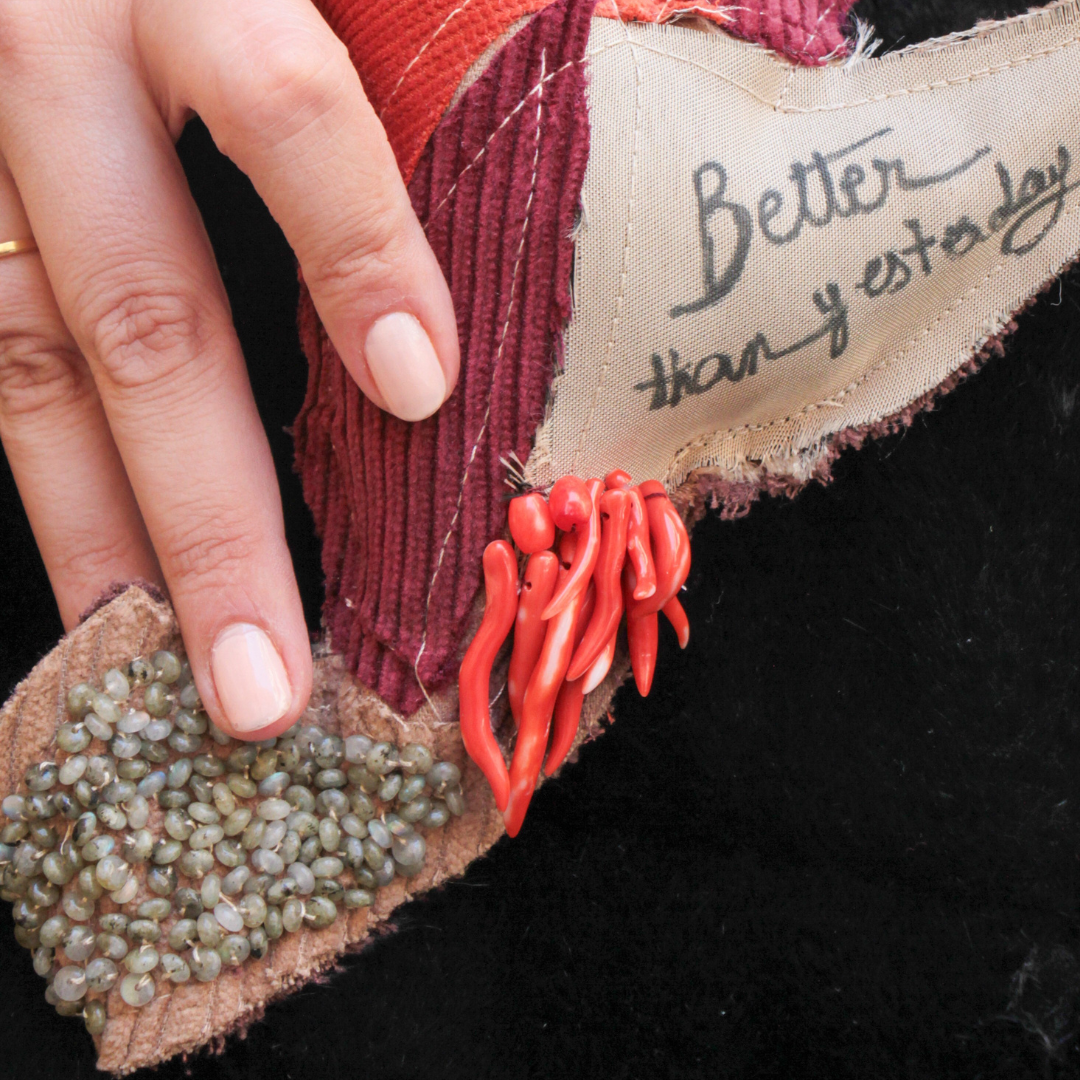 The Free Bird Bag Charm by Reeta El Khoury is made of leftover fabrics and combines soft textures and warm colors to evoke emotion and memory. The bird symbolizes freedom and moving forward. “Better than Yesterday” echoes the work’s message: healing takes time, and each step counts. A braided thread connects past and present, reminding us that we can carry love, pain, and growth, and keep flying anyway.