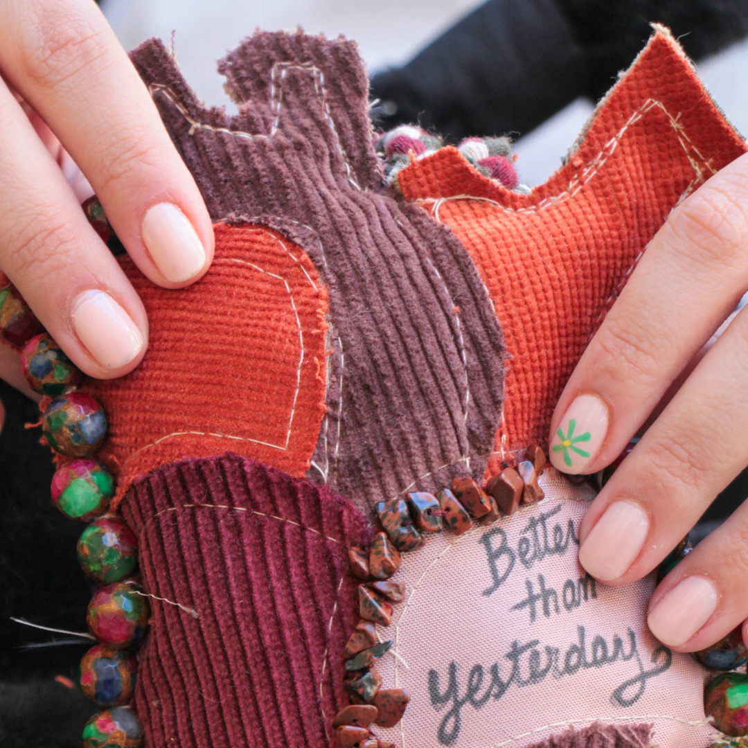 The Healing Heart Bag Charm by Reeta El Khoury is made of leftover fabrics and combines soft textures and warm colors to evoke emotion and memory. The heart is a symbol that carries all that is left behind, from pain to beauty. “Better than Yesterday” echoes the work’s message: healing takes time, and each step counts. A braided thread connects past and present, reminding us that we can carry love, pain, and growth, and keep flying anyway.