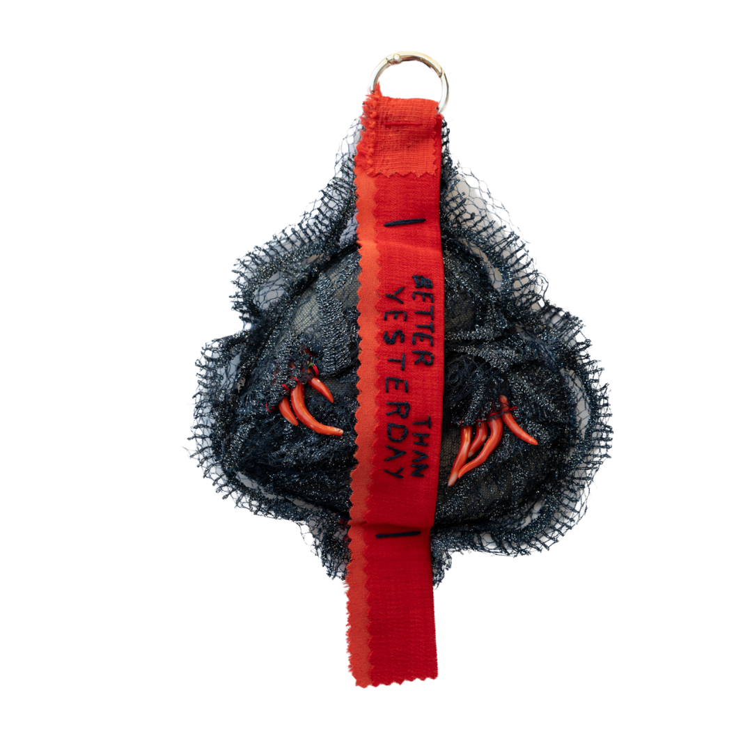 The Shadow Heart Bag Charm by Sonia Milkesitian features a heart wrapped in shadows and stitches, pulsing with courage and the promise: Better Than Yesterday. Even in the cracks, it dares to burn brighter.