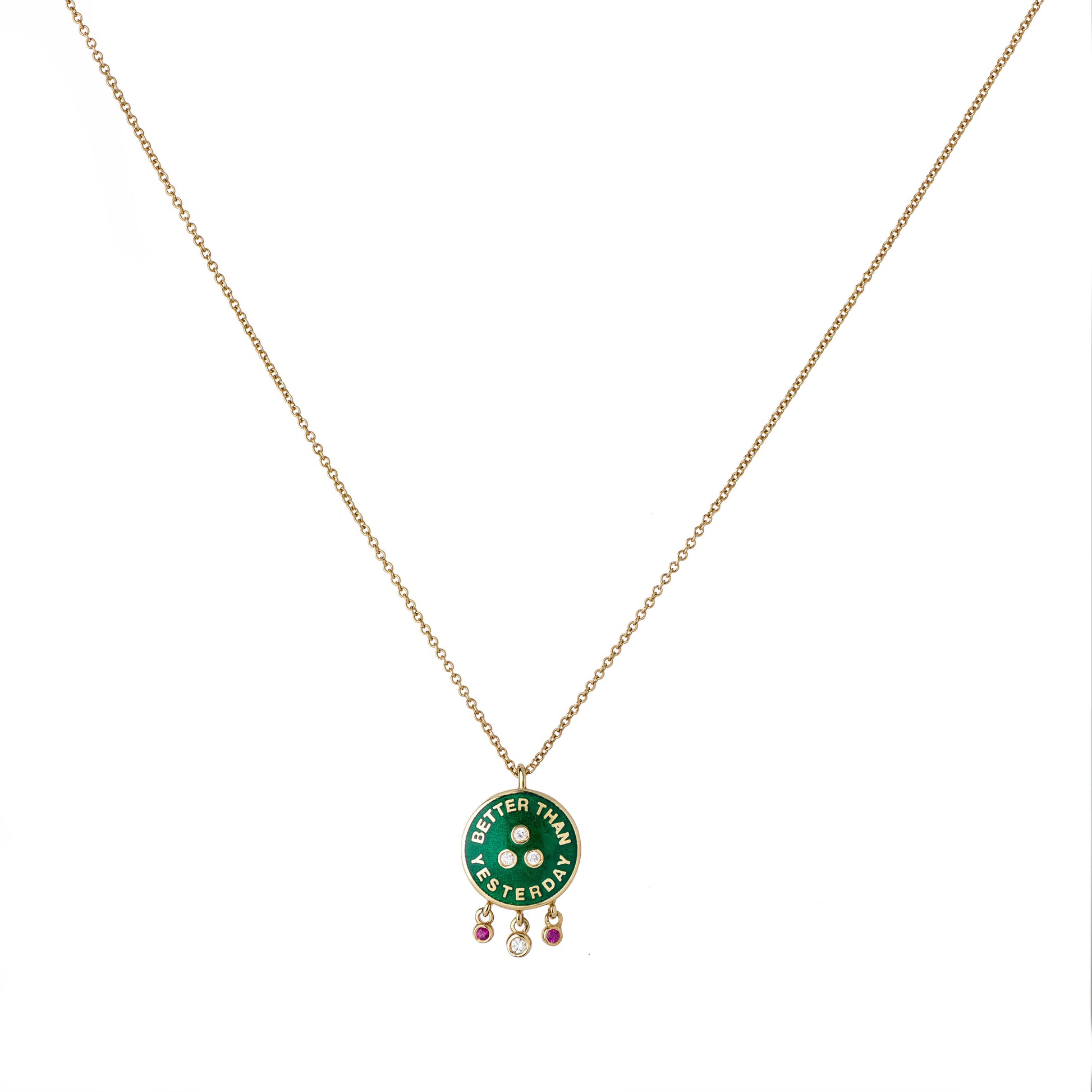Embrace optimism and repel negativity with our Better Than Yesterday Necklace. Crafted in 18kt rose gold, this coin pendant features three white diamonds at the center, surrounded with a message of hope: "Better Than Yesterday." and dark green enamel. The pendant also features three hanging stones, a diamond surrounded by two rubies.