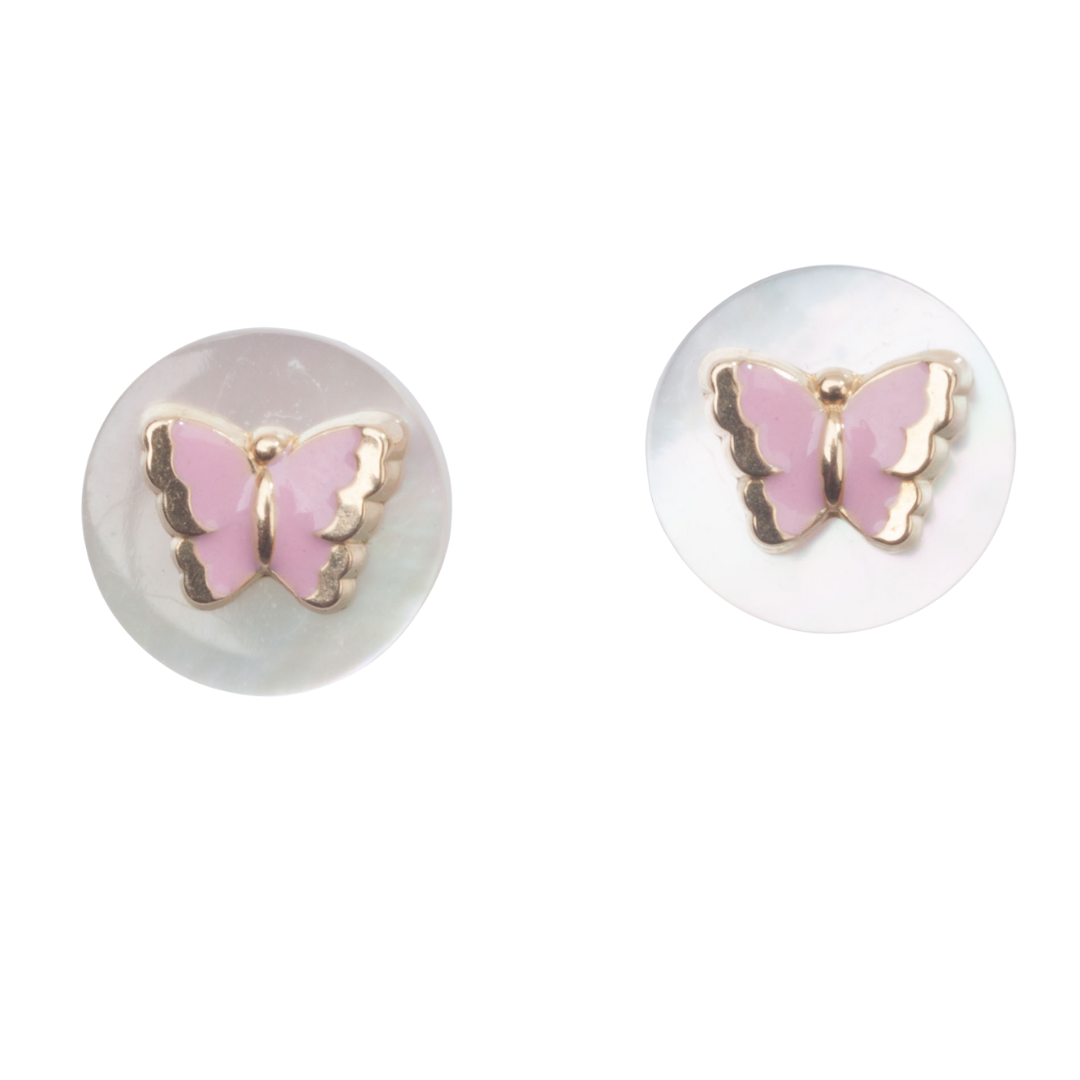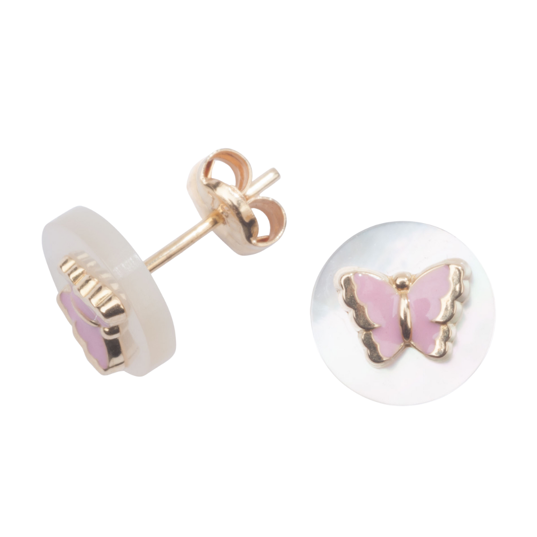 These delicate stud earrings are a charming choice for little ones, and just as fun for grown-ups looking to add a playful touch to their ear candy. Crafted in 18kt yellow gold, each stud features a soft mother of pearl base adorned with a light pink butterfly, making them a thoughtful gift for babies and kids, or a whimsical addition to your own collection.