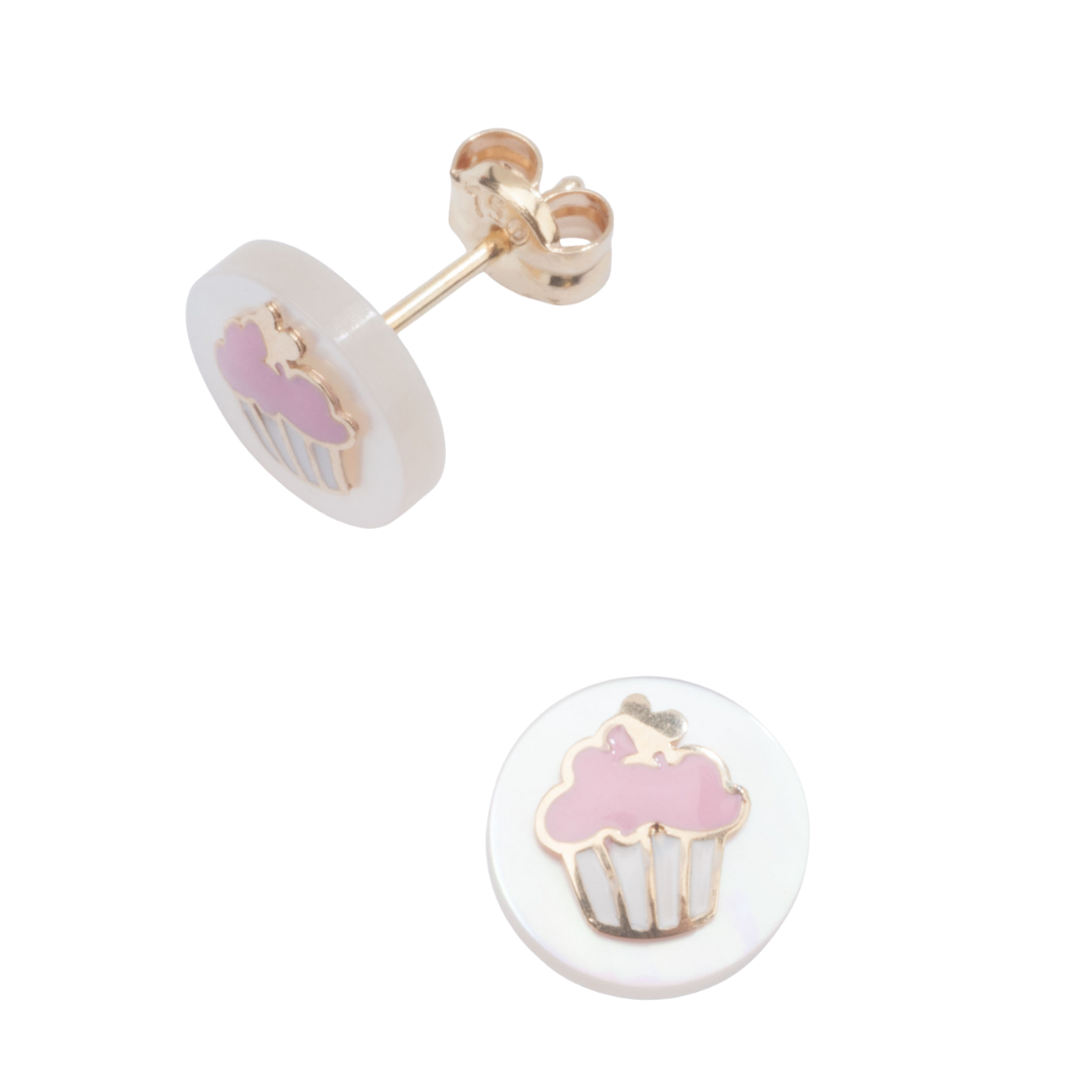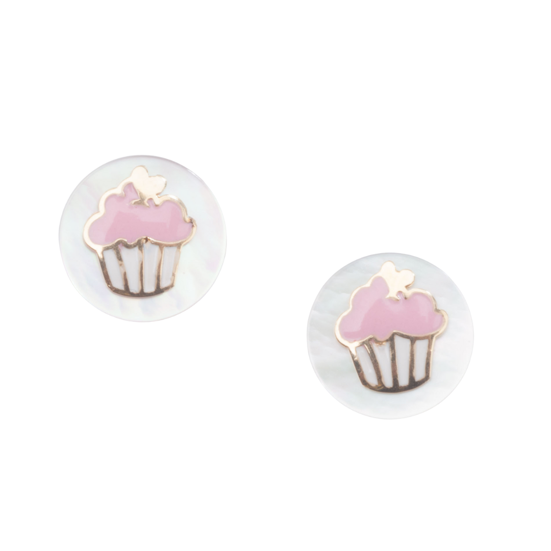 These delicate stud earrings are a charming choice for little ones, and just as fun for grown-ups looking to add a playful touch to their ear candy. Crafted in 18kt yellow gold, each stud features a soft mother of pearl base adorned with a light pink cupcake, making them a thoughtful gift for babies and kids, or a whimsical addition to your own collection.
