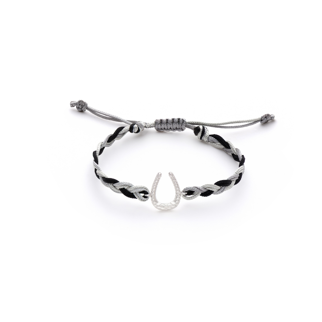 The Mukhi Sisters Harmony Guard Bracelet is the brand's latest talisman, designed to empower and protect the wearer. This silver bracelet features the Harmony Guard horseshoe charm, crafted from silver, adorned with the snakeskin texture, hanging on a black and grey colored braided strap.