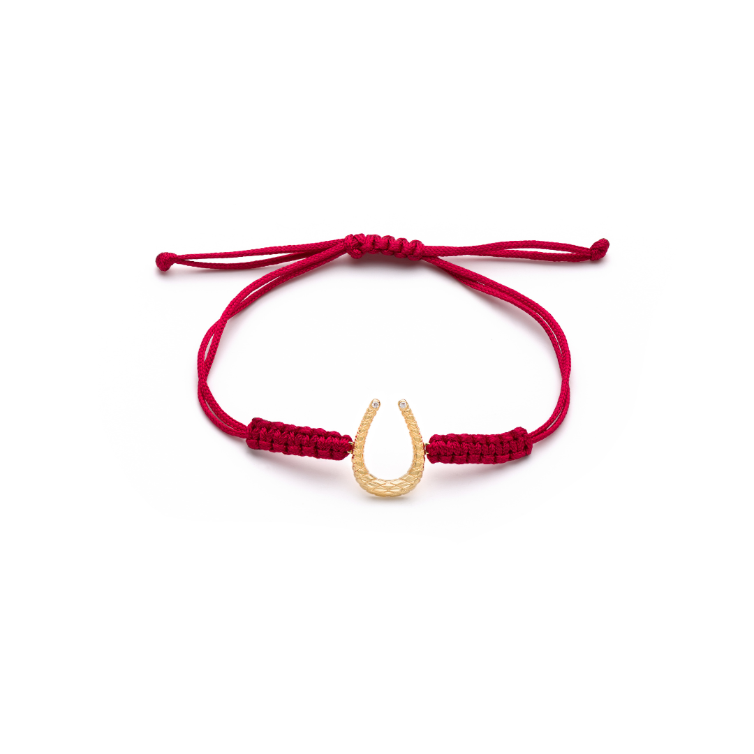 The Mukhi Sisters Harmony Guard Bracelet is the brand's latest talisman, designed to empower and protect the wearer. This bracelet features the Harmony Guard horseshoe charm, crafted from 18kt yellow gold, adorned with the snakeskin texture, at the center of red colored adjustable straps.