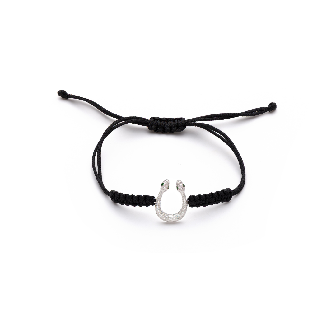 The Mukhi Sisters Harmony Guard Bracelet is the brand's latest talisman, designed to empower and protect the wearer. This bracelet features the Harmony Guard horseshoe charm, crafted from 18kt white gold, adorned with the snakeskin texture along with snake heads on either side with tsavorite eyes, at the center of a black colored adjustable strap.