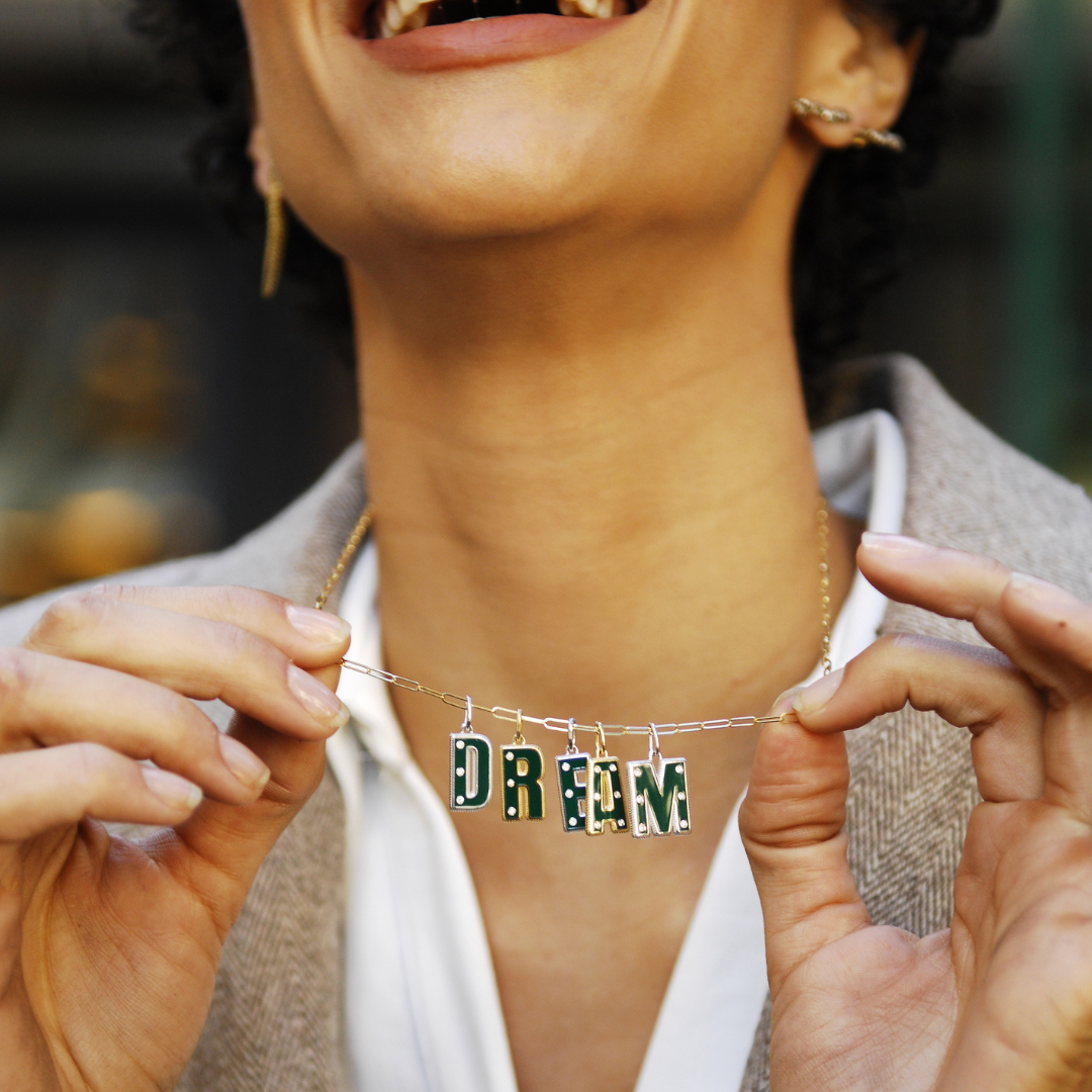 This is the Mukhi Sisters’ take on the classic initial pendant, but of course with a MS twist that gives each letter charm and character. Crafted in 18kt yellow gold, this "N" pendant features a vibrant green enamel, accented with six sparkling round diamonds. This pendant is designed to become your signature piece, instantly adding personality to any look.