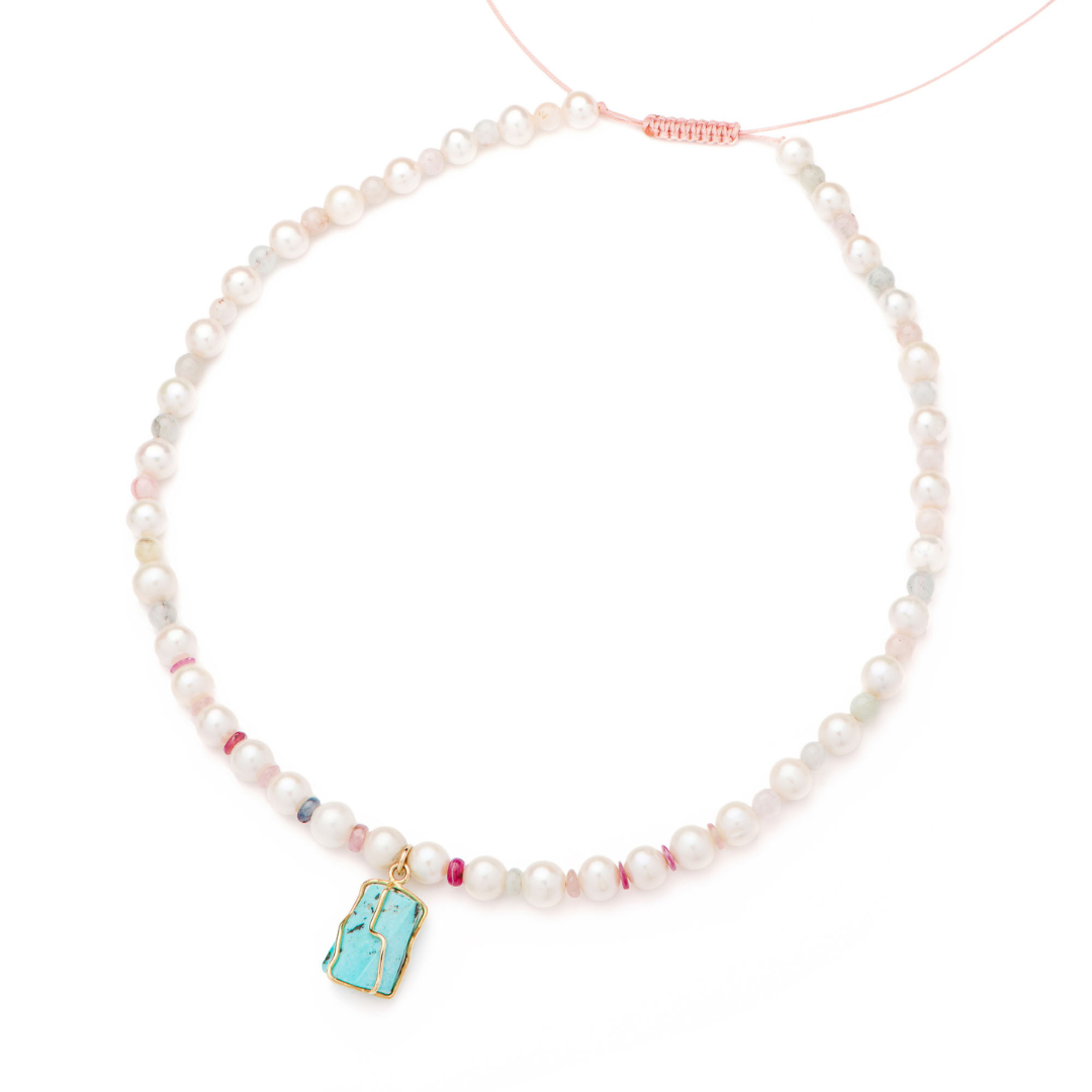 Crafted with a delicate blend of white pearls and a colorful rainbow of semiprecious stone beads, the adjustable Pearls of Wisdom Rainbow Necklace exudes elegance and sophistication. The centerpiece, a captivating 18kt yellow gold pendant adorned with a vertically set organic-shaped turquoise, adds a touch of luxury and spiritual significance.