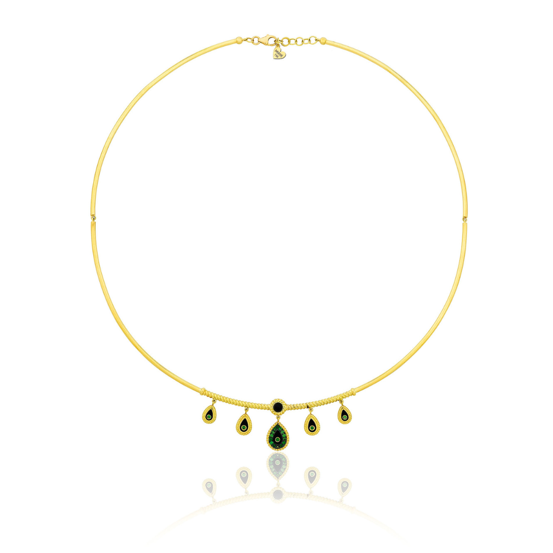 Crafted from 18kt yellow gold, the Protection and Prosperity Necklace from Mukhi Sisters Superhero Collection, is a striking representation of strength and elegance. This matinee necklace, sits between the collar bone and the bust. It features a central drop-shaped charm with two smaller charms on each side, each adorned with black enamel and, vibrant green tsavorite stone and outlined by a twsited gold detail. The combination of these elements creates a visual representation of a kite shaped shield, holding promises of renewal and transformation.