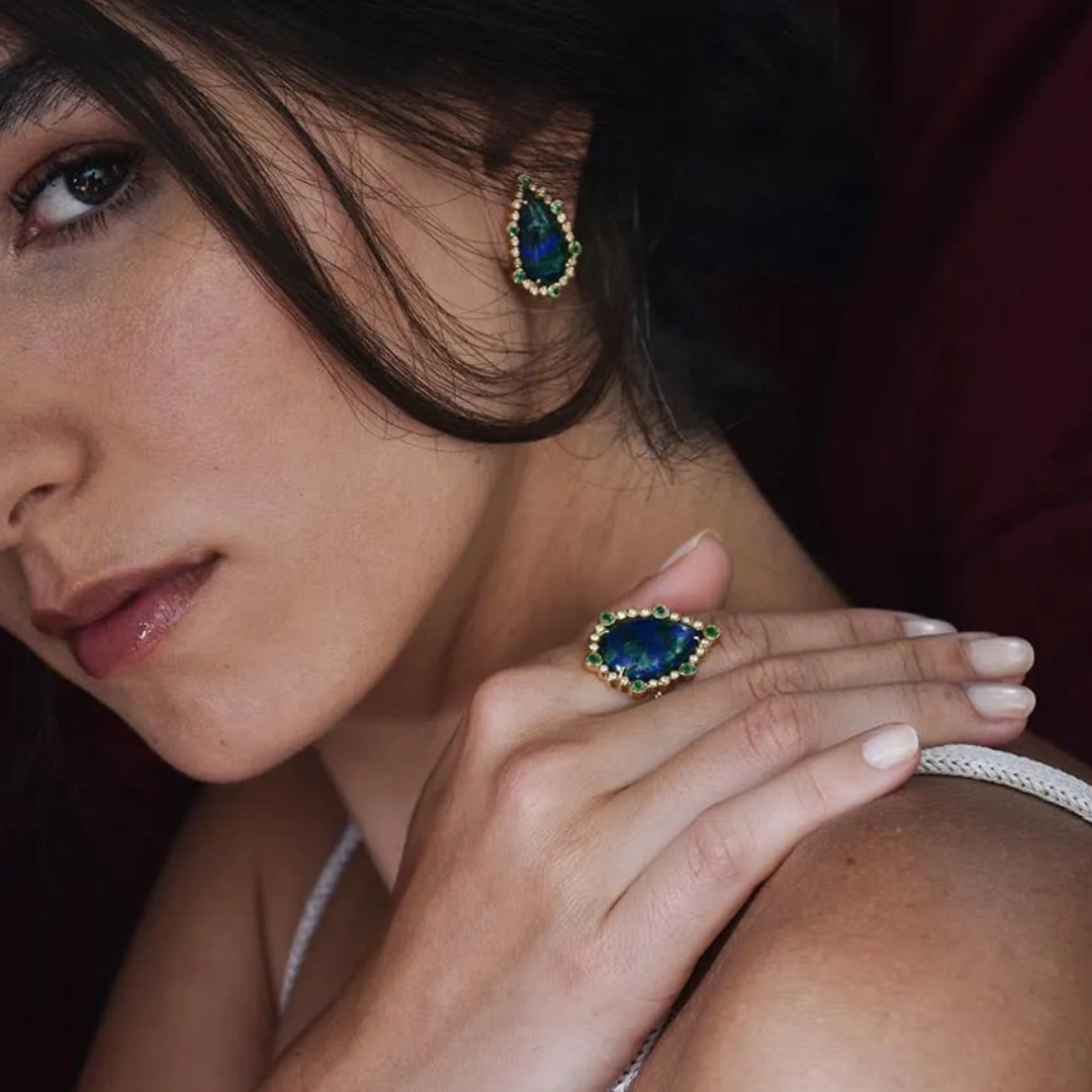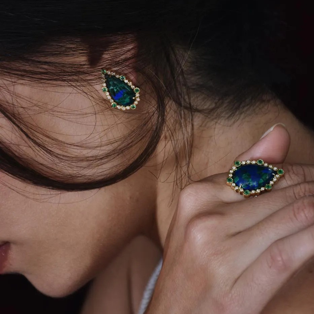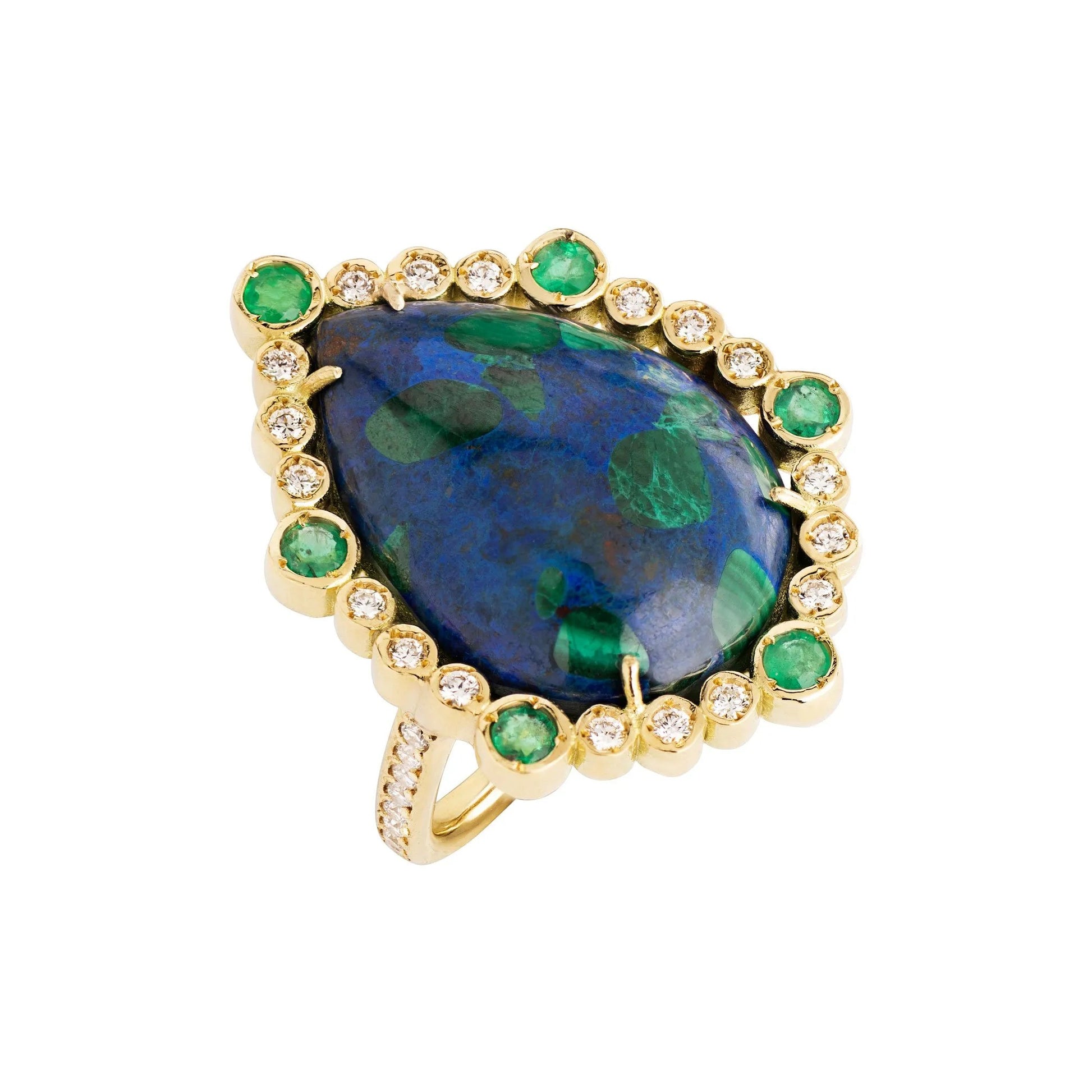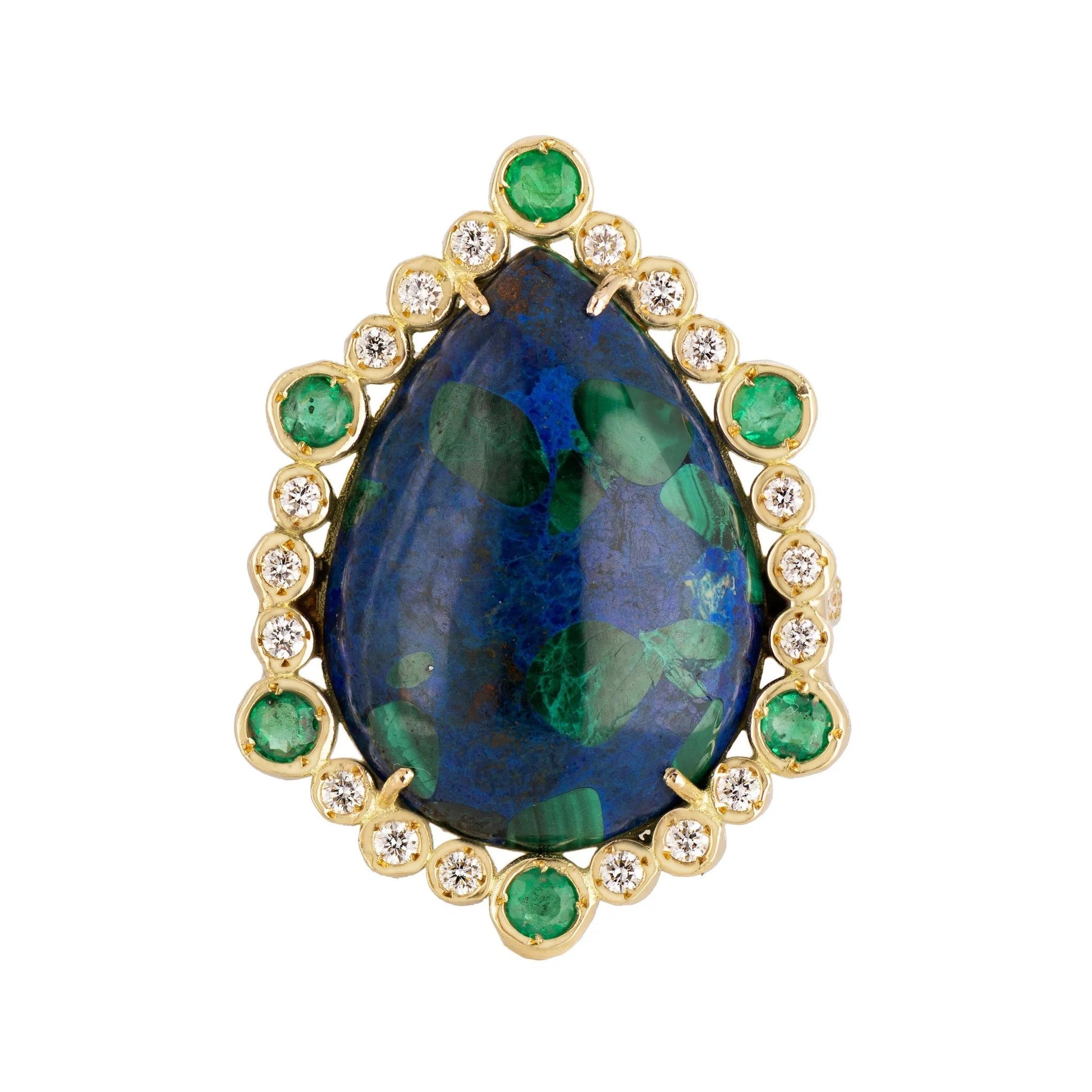 This extraordinary piece features a mesmerizing drop-shaped azurite malachite stone, resembling our precious planet Earth, surrounded by a dazzling halo of round diamonds and emeralds.