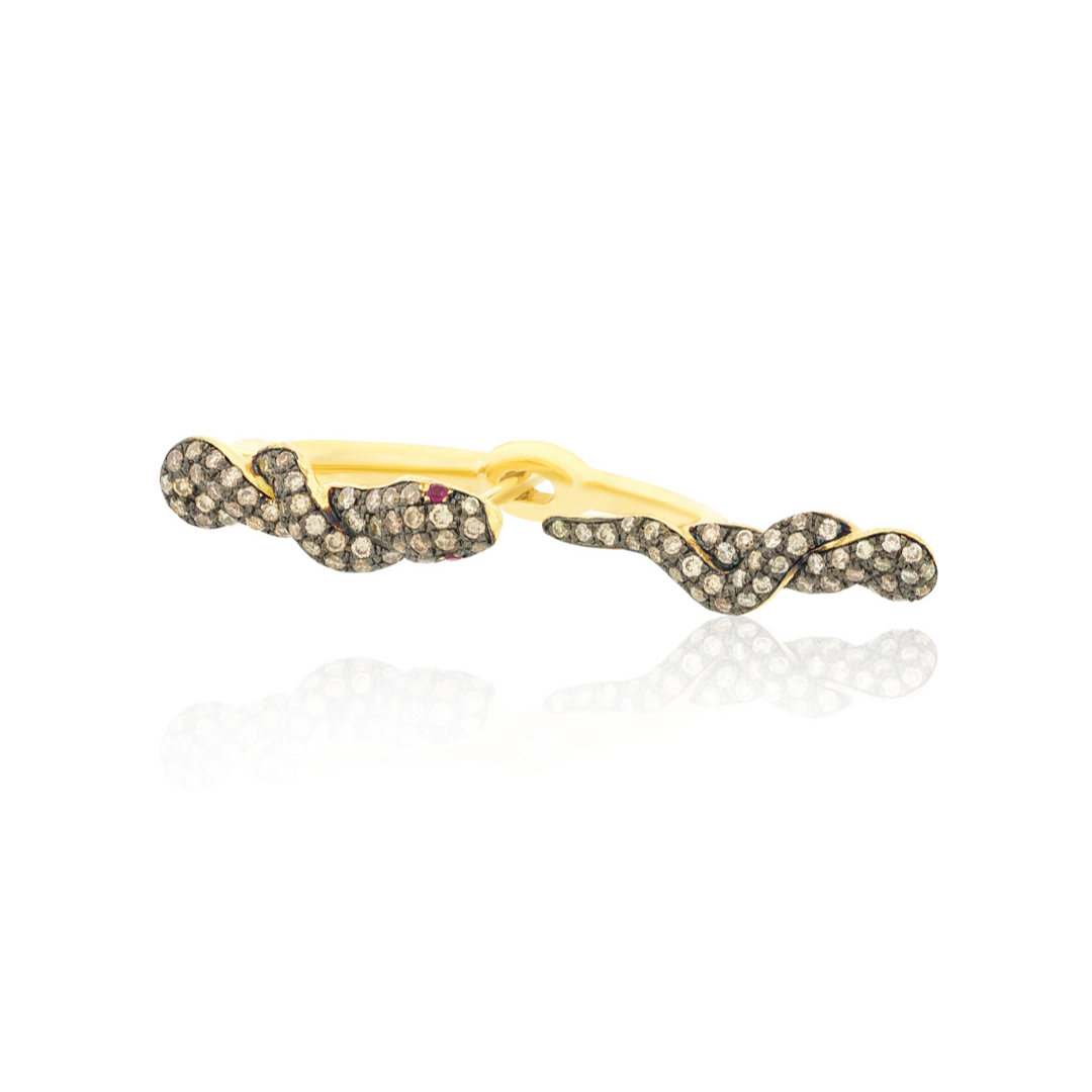 From the No Guts No Glory collection by Mukhi Sisters, the Transformation Snake Solo Earring is a statement of resilience and growth. Crafted in 18kt yellow gold, this one-sided earring features a snake adorned with brown and white diamonds and striking red ruby eyes. Designed to "hug" the earlobe, it is both elegant and empowering.