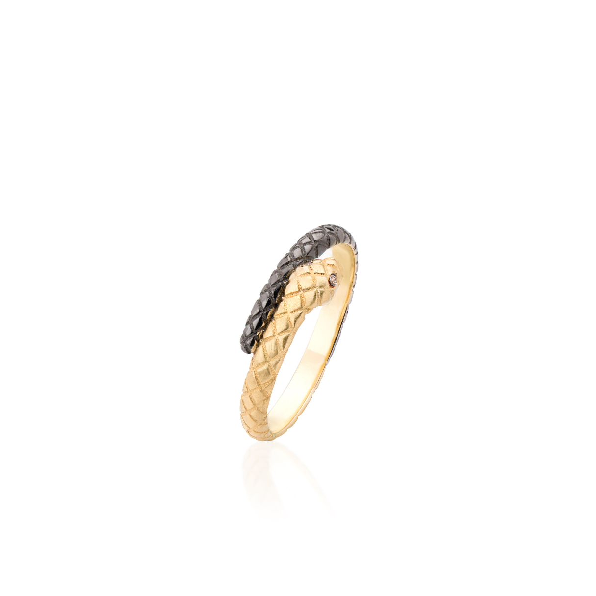 Feel the essence of transformation with the Serpentine Ring. Crafted in two tones of 18kt gold, yellow gold and oxidixed gold, this ring showcases a serpent design that symbolizes evolution and the journey of life. The snake’s eyes, set with rich brown diamonds, add a touch of subtle brilliance. The Harmony Guard collection celebrates romance as more than just candlelit dinners, inviting you to cherish every facet of who you are. This ring, which can be worn as a pinky ring, embodies the harmony between delicate elegance and the bold expression of your inner fire, serving as a reminder of your personal evolution and the beauty of embracing every stage of life.