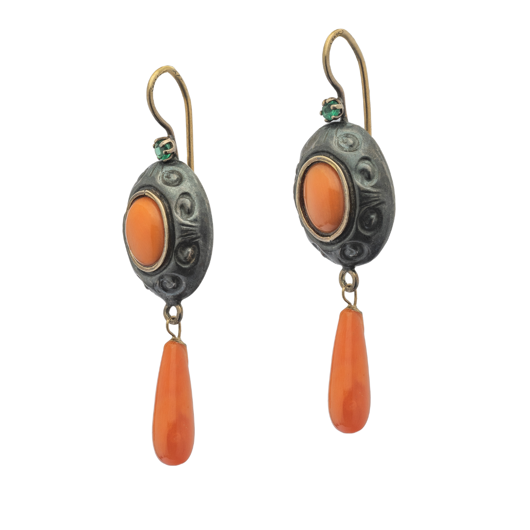 Step back in time with our Victorian Revival Coral Earrings, a stunning piece from the Mukhi Sisters' "Queen Vicky" collection. These earrings are a testament to timeless elegance and sustainable luxury. Featuring 9kt gold and upcycled coral stones, the design boasts an oval-shaped coral stone, a delicate drop of coral, and a touch of green Tzavorite.