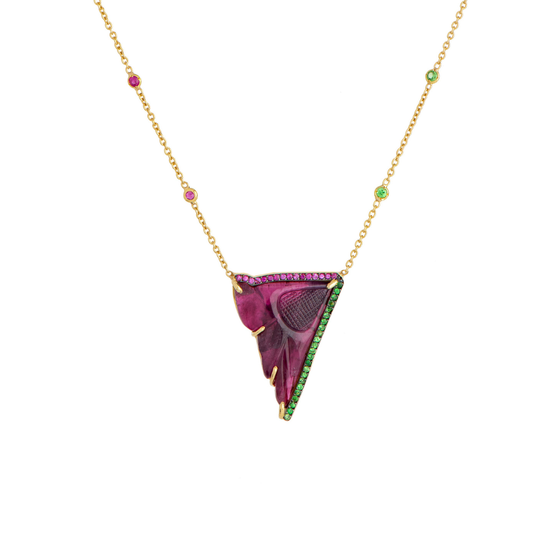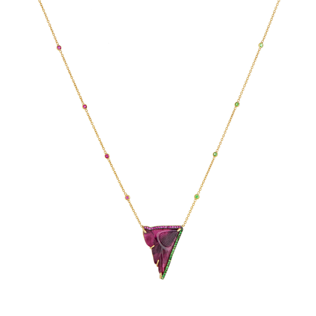 This vibrant necklace captures the essence of summer in a single piece. A stunning triangle-shaped watermelon tourmaline, reminiscent of a leaf, takes center stage in this 18kt yellow gold pendant. Surrounding the tourmaline, an asymmetrical arrangement of tsavorite and pink sapphires adds a playful touch. Wear it alone for a romantic look or layer it for a bohemian-inspired style. The watermelon tourmaline is believed to offer love, light, and rejuvenation, making this necklace more than just a piece of jewelry – it’s a symbol of optimism and vitality.
